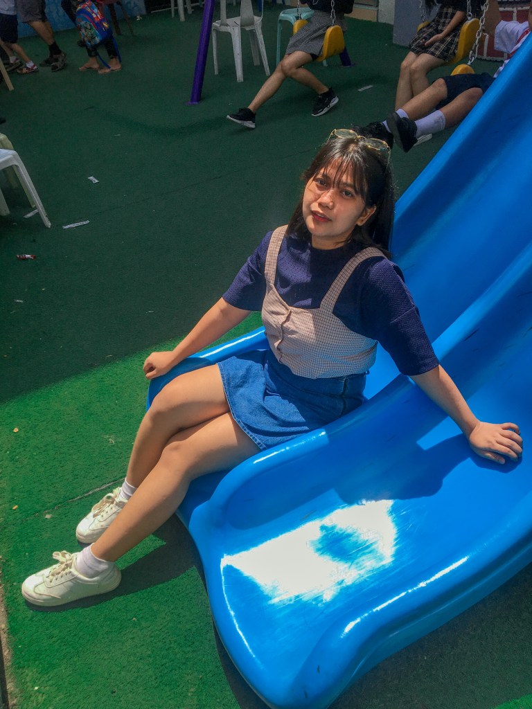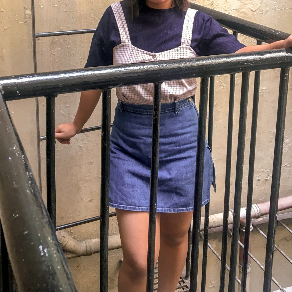 April is wearing a dark blue shirt and a checkered sando top with a faded denim skirt and a pair of white sneaker shoes.