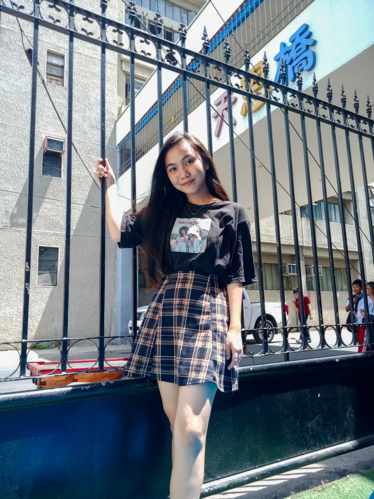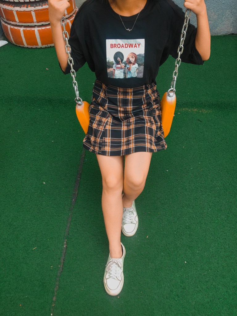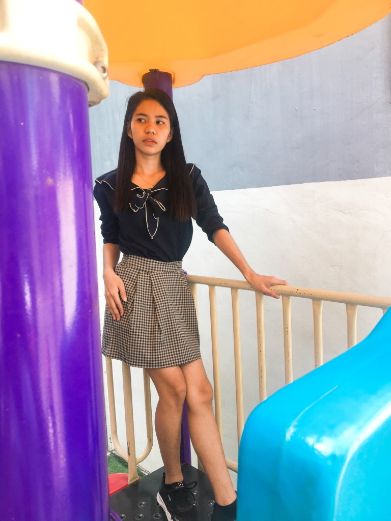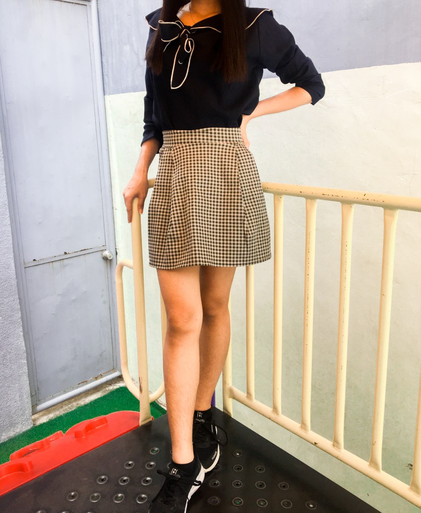 Rezly is wearing a black-collared top and a checkered skirt and a pair of black sneaker shoes.