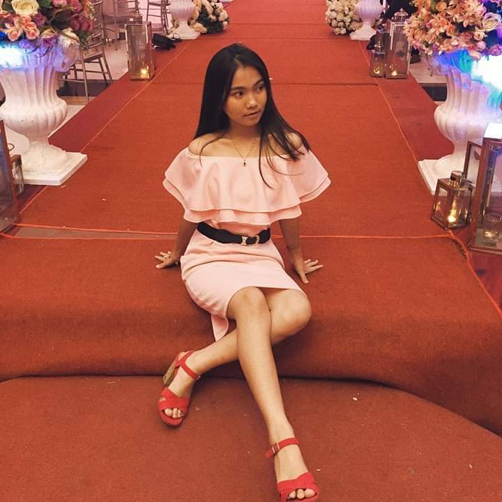 Rezly is wearing a navy blue with upper floral white dress. Paired with a silver heels. Wearing a pink shoulder bag.